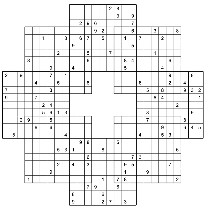 Voici un jeu que j'ai négligé de vous présenter, il s'agit du Sudokus dansant. Ce puzzle est composé de 8 Sudokus qui sont en train de danser une ronde en se tenant par la main (C'est l'image qui me vient à l'esprit). Mon livre Spectacular Sudoku Variants en contient plusieurs.