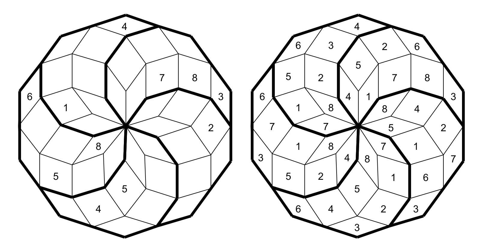 Le Sudoku Décagone se démarque par l'utilisation d''une grille de 10 cotés (décagone une figure géométrique de 10 cotés). Le jeu se compose de 20 lignes et de 5 régions. Il faut placer dans ces lignes et régions les nombres de 1 à 8. Les régions peuvent êtres régulières, (comme dans la figure ci-haut) ou bien de forme irrégulières. Comme la grille n'est pas rectangulaire, les cases sont des losanges de différentes formes et tailles. Ce qui fait que les lignes ne sont pas rectiligne car les cases ne sont pas des rectangles mais des losanges.e truc pour pouvoir suivre une ligne est de commencer par le coté d'une case qui touche le bord du décagone et ensuite pour trouver la case suivante, il faut choisir la case qui touche le coté opposé et ont fait cela à chaque cases pour trouver la suivante jusqu'a ce que l'on se rende à l'autre coté de la grille.