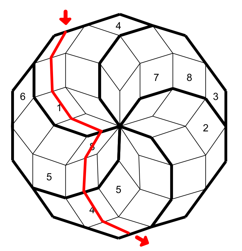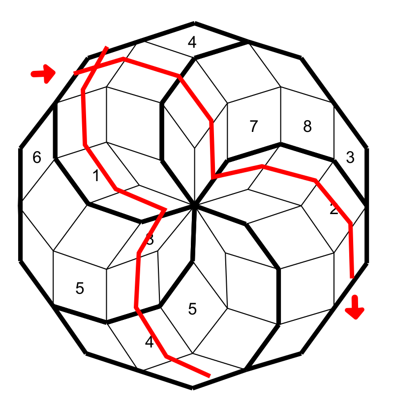 Par exemple dans la figure suivante si on part du coté de la case indiquée par la flêche, le chemin en rouge indique les cases de la ligne, vous remarquerz que la case suivante d'une case dans la ligne est celle qui touche au coté opposé de cette case.