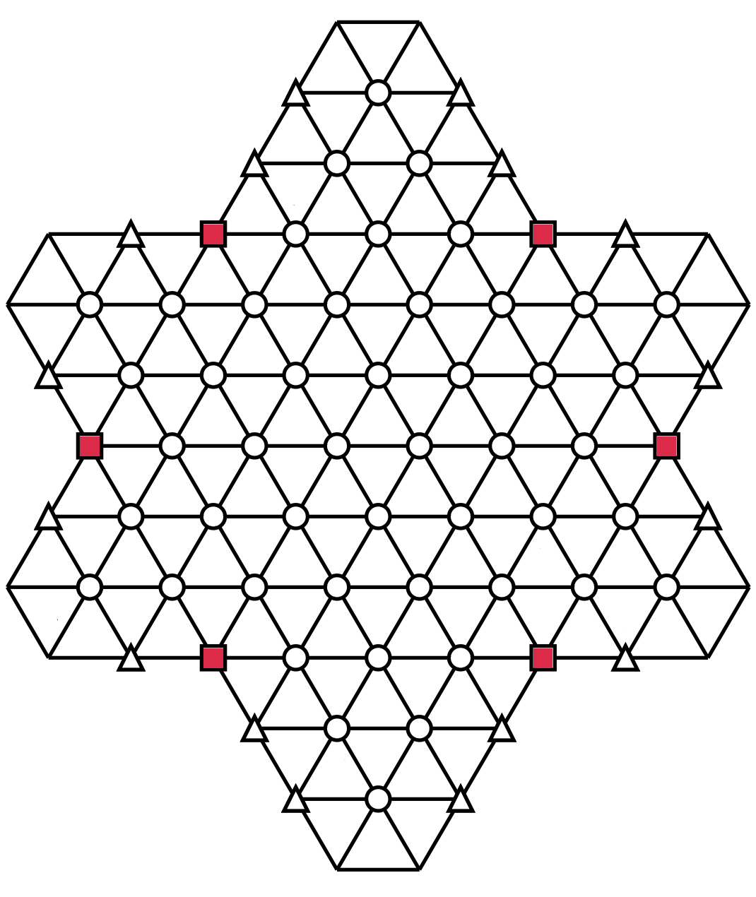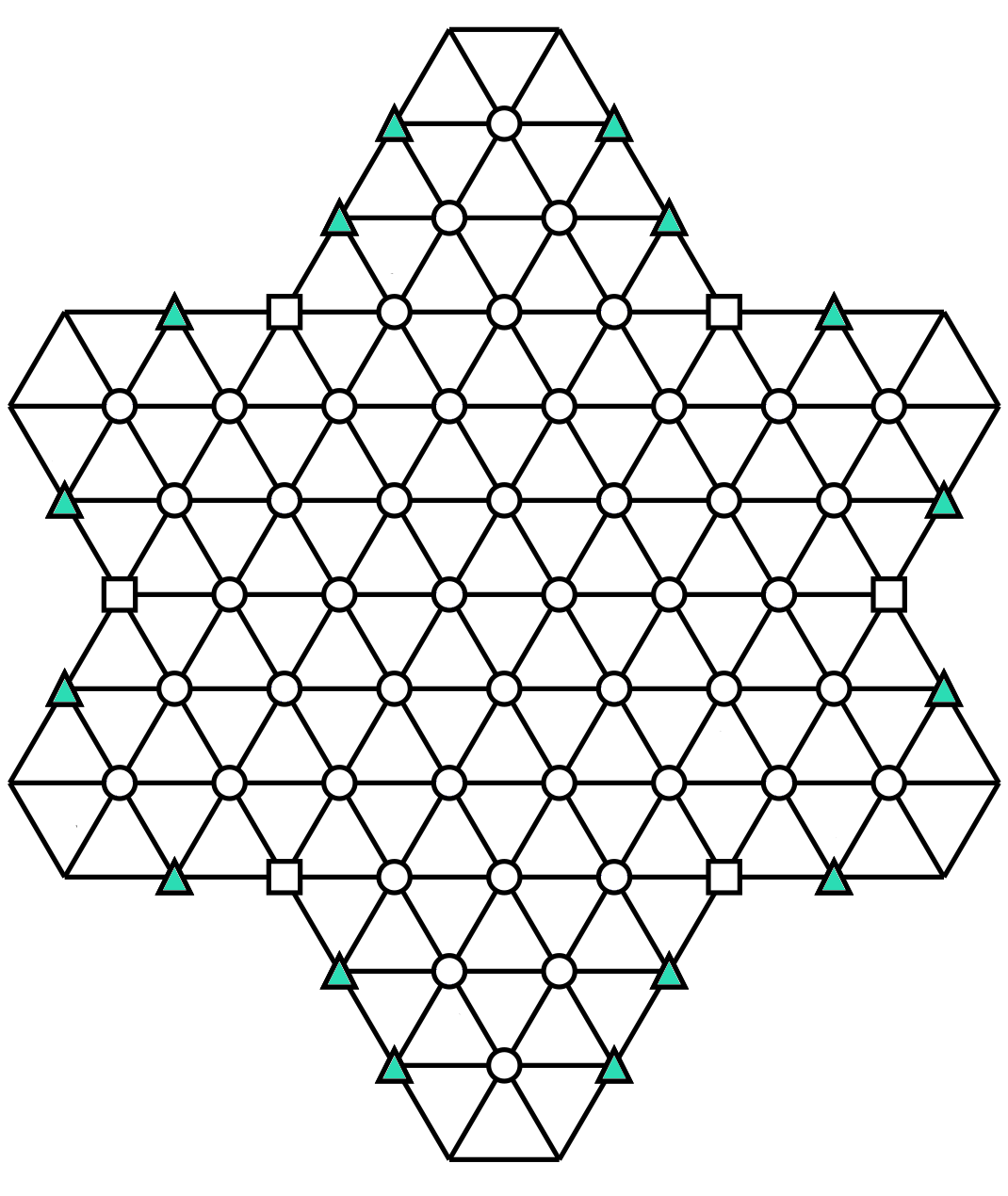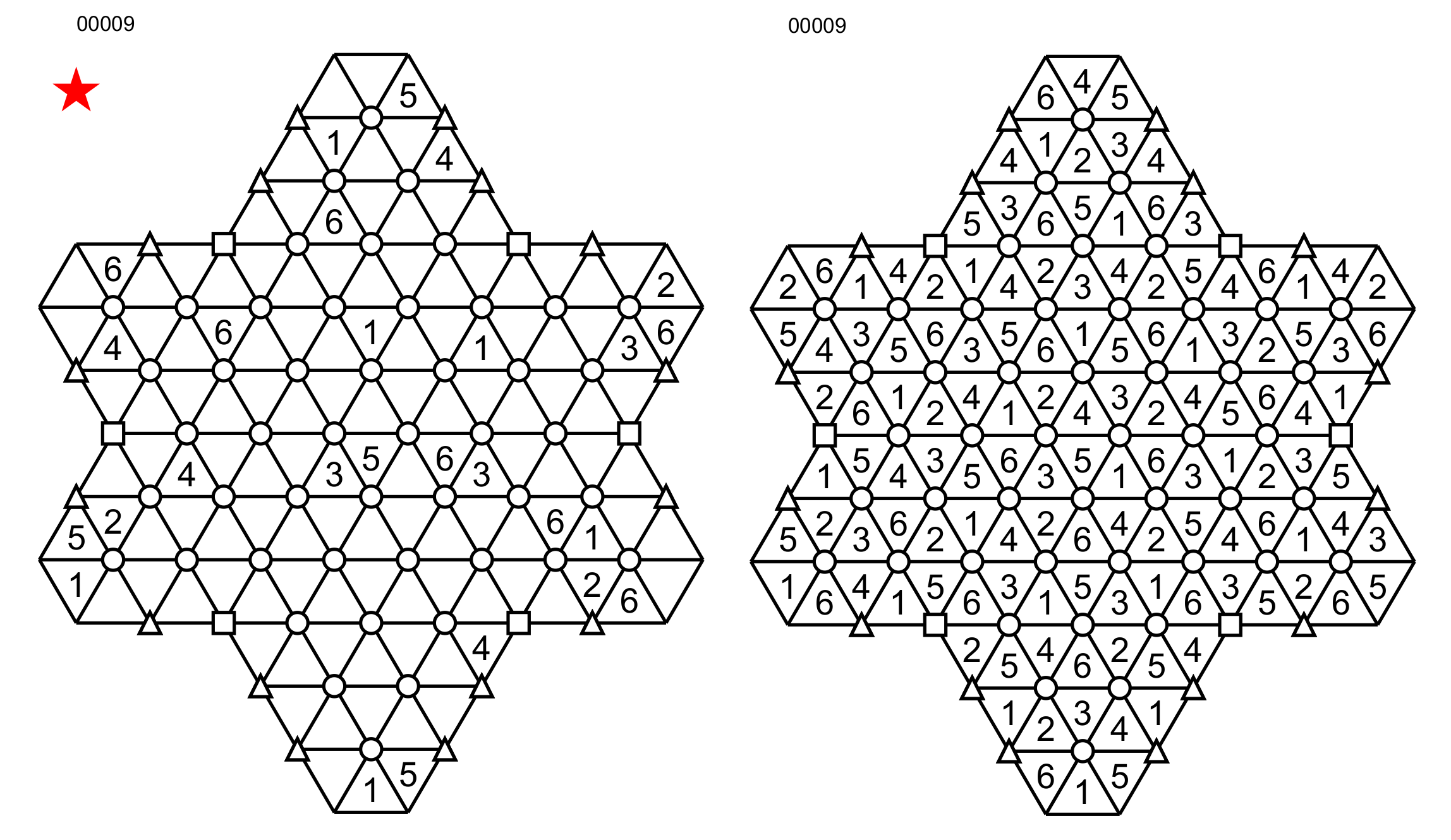 And last but not least: there are 3-triangle partial hexagons with a small triangle at their center (green). Enter 3 different numbers from 1 to 6 around the small triangles.