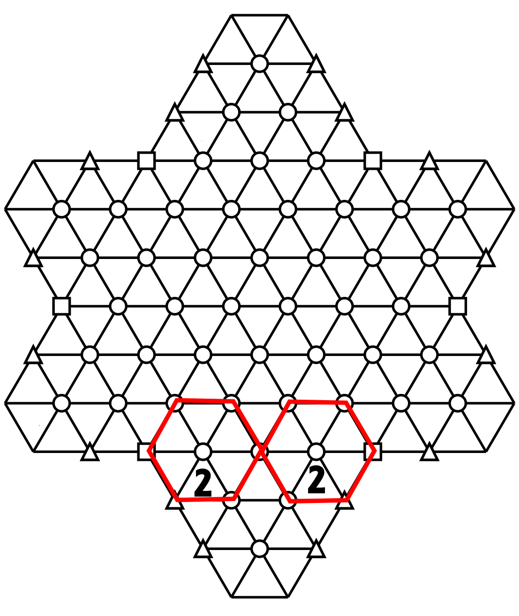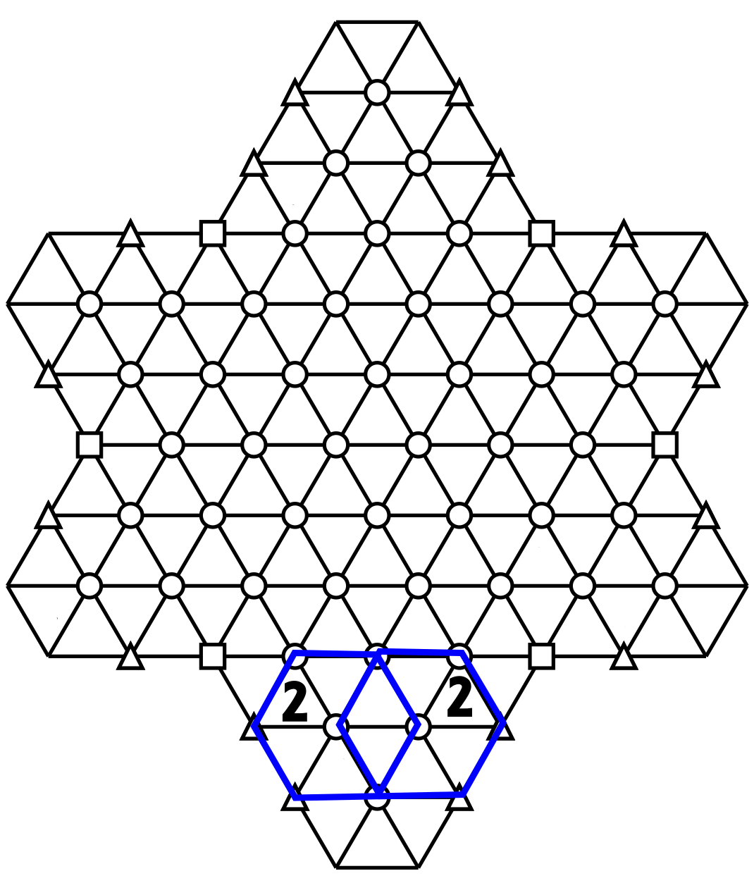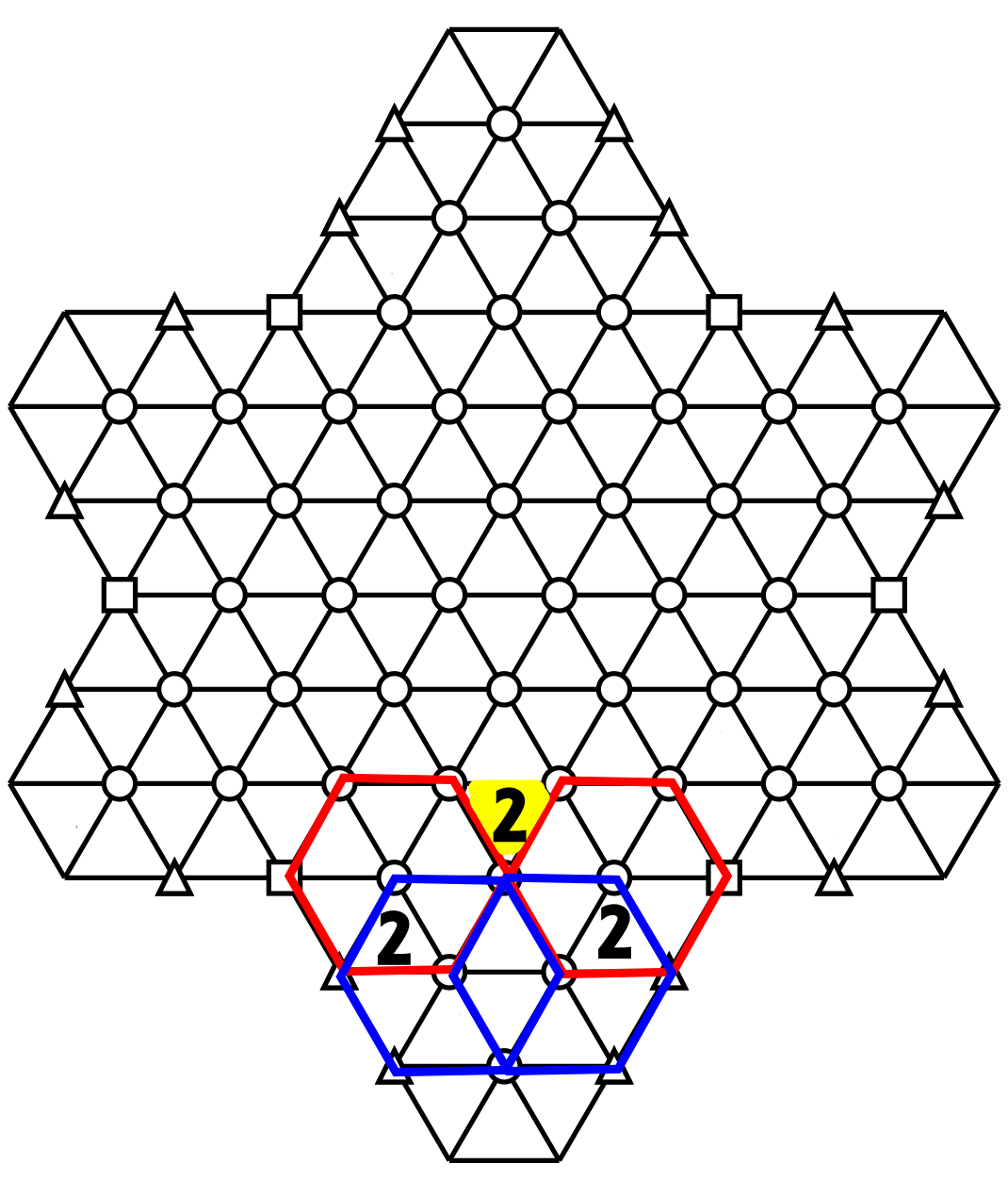 The two triangles point upwards, have the same number and are separated by three cells. We know that both belong to two different hexagons. The first hexagons are outlined in blue.